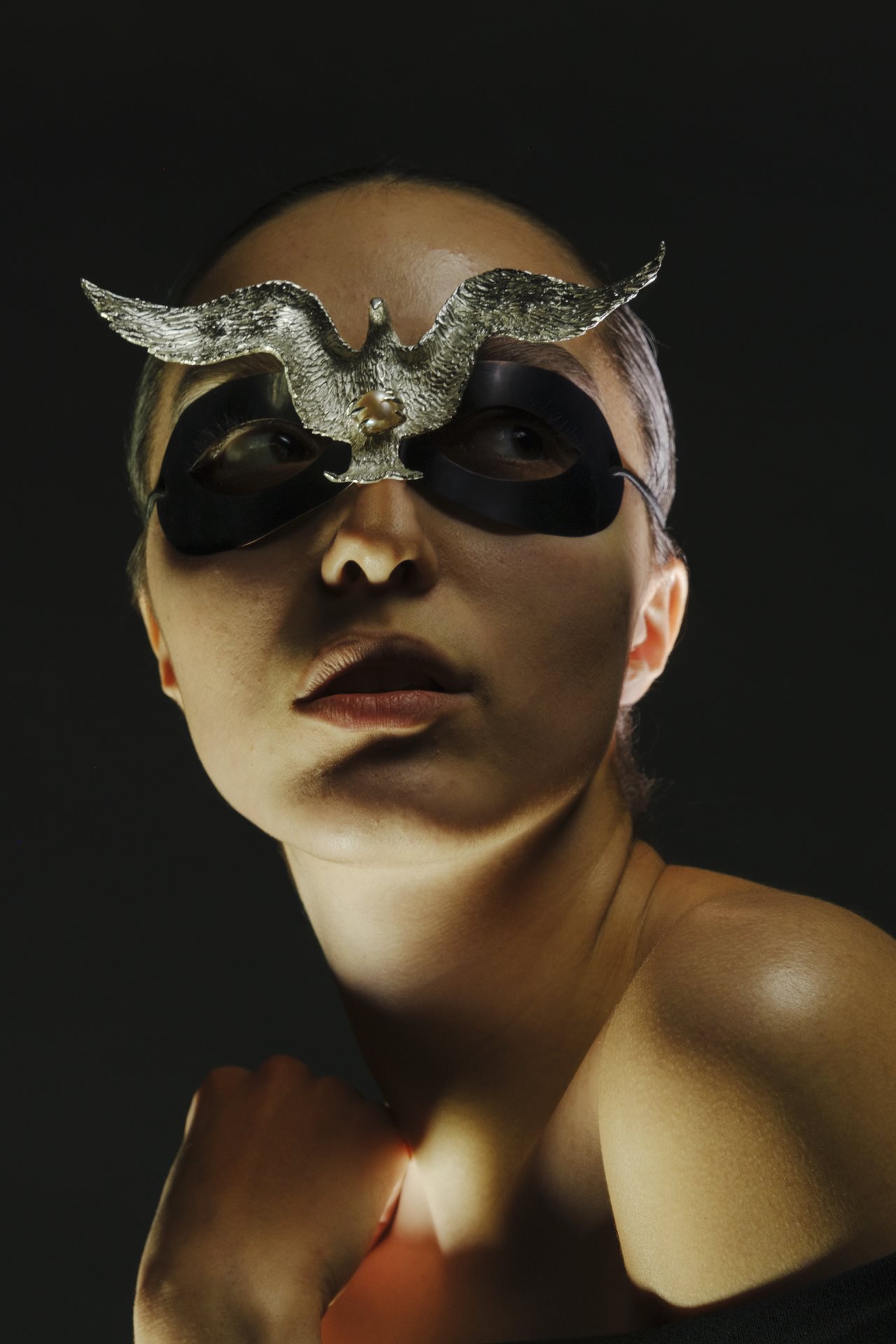 "A word is not a sparrow - once it flies away you won't catch it" is a Ukrainian proverb that speaks about the importance of being careful with your words, because once spoken, they cannot be taken back. I created a work that symbolises the idea of freedom and, at the same time, restrained emotions before they take over - a copper mask and a dramatic silver eagle with its wings spread wide, clutching a pearl in its talons. The piece is complemented by a silver 'bird shaped' ring.