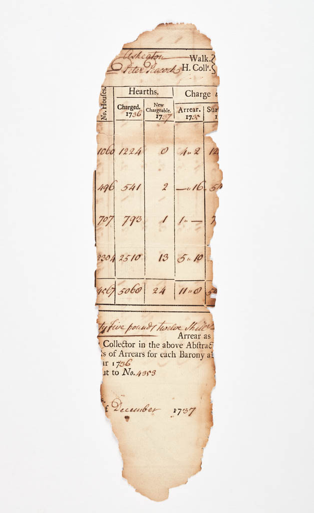 HE:EWL.237d: Burned fragment of a tax roll (Limerick, 1737), found after the destruction of the Four Courts, 1922.
