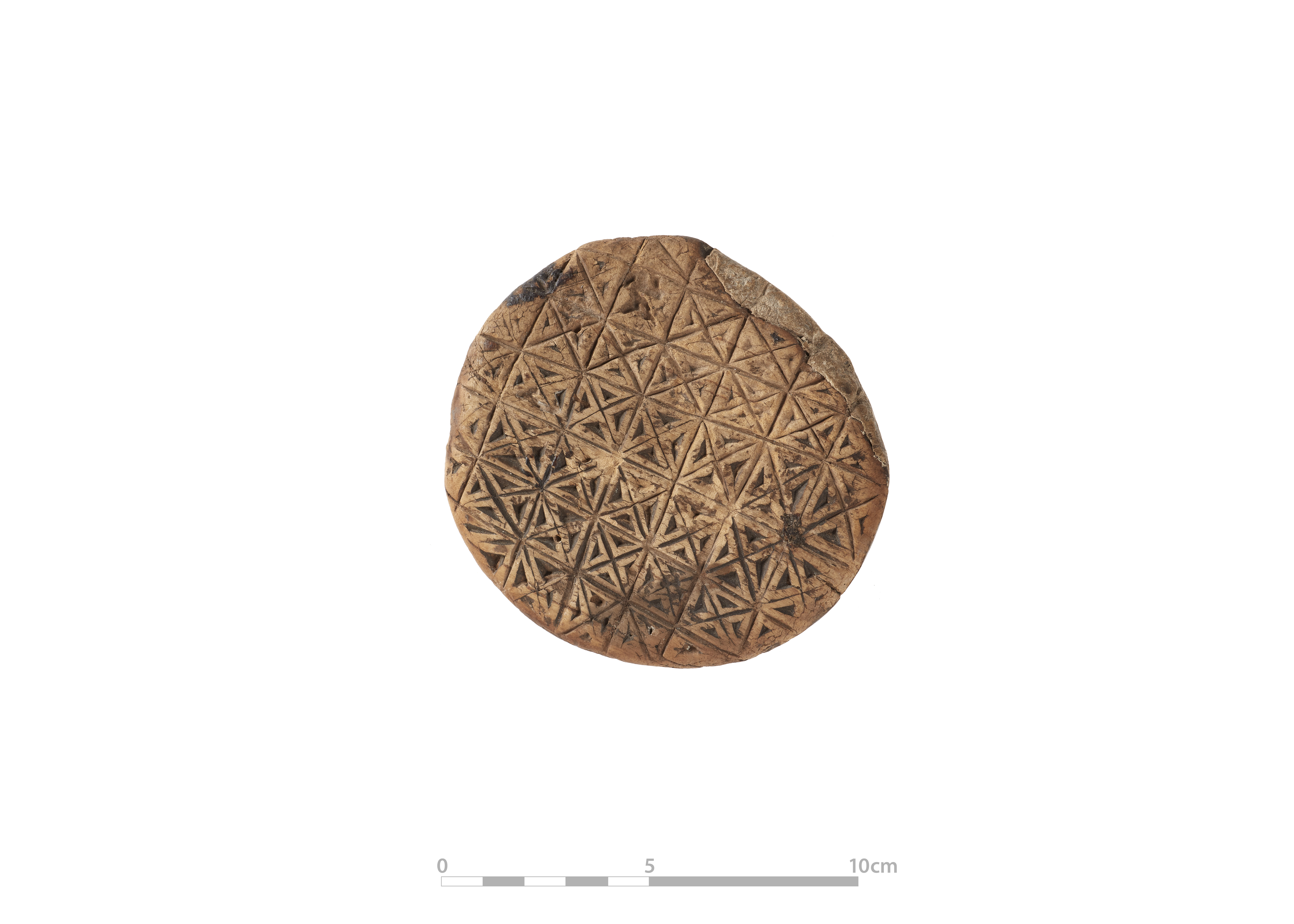 Light wood with repeats of four small triangles creating a hatched design. The oldest butterprint in the collection with the date ‘1773’ and letters ‘M, B,’ carved on the back.