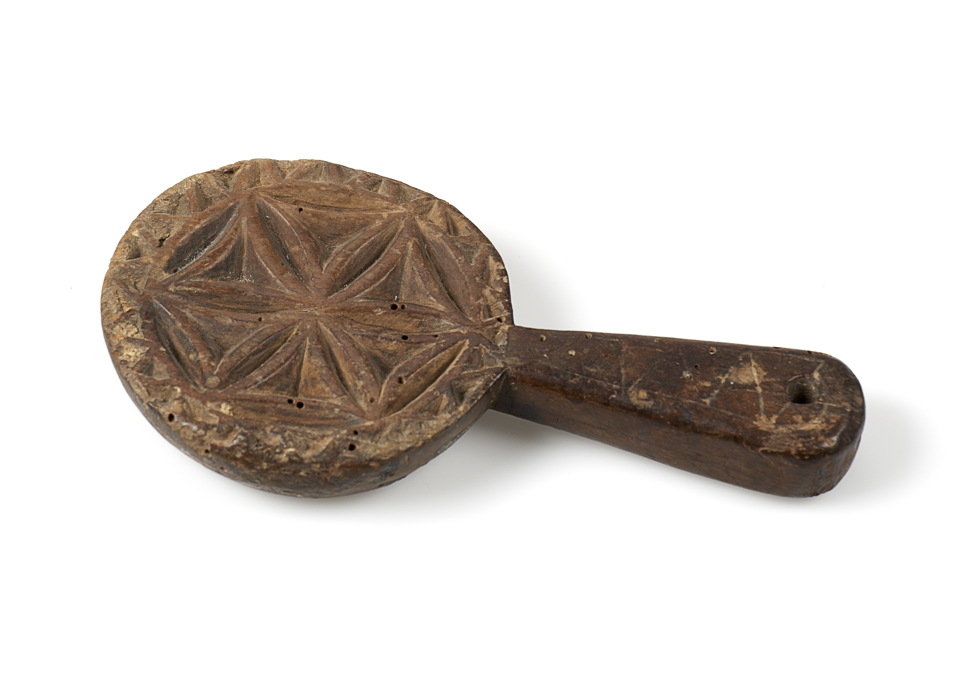 Marigold with incised triangles and a border of triangular chippings. At the base of the handle is a suspension hole.