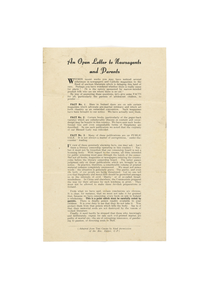 This leaflet informed parents about ‘obscene’ books and warned shopkeepers it was a ‘mortal sin’ to sell them. Instituted in 1929, the Censorship of Publications Board imposed a censorship regime that was gradually reformed from 1967. Although relying on the public to submit publications for banning, most complaints came from Catholic vigilance societies. The letter is taken from "The Cross", a Catholic publication. It insists that certain publications are a source of corruption. It argues that Censorship Board does not go far enough, and that more reading material needs to be regulated.This letter shows how a culture of shame persisted in Ireland. It also indicates the power of the Catholic Church at that time.