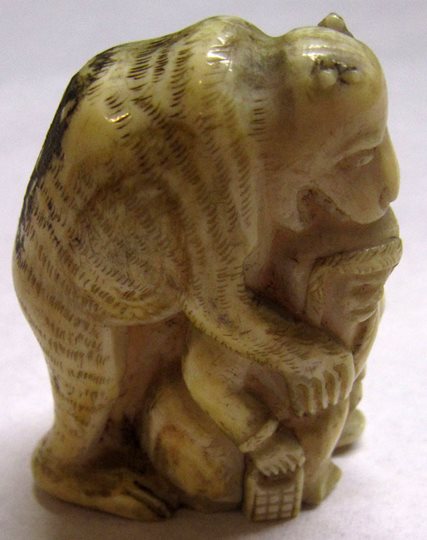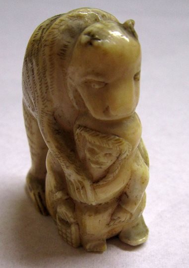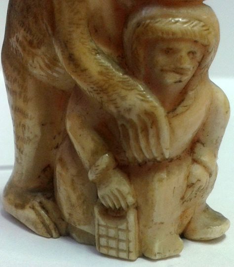 It is likely that the bear depicted in this piece is actually a polar bear, and the figure of the “Greenlander” an Inuit. The Inuit in Canada and Greenland were one of the societies believed to practice the cult of the bear. The polar bear, the most prized animal hunted by the Inuit, is known as Nanuk, and their mythology proclaims him as a powerful master of bears with shape-shifting abilities to transform to man. Perhaps the gaming piece demonstrates the relationship between the Inuit and the polar bear to the foreign onlooker - their shared natural environment, and their mutual danger to each other as hunters.