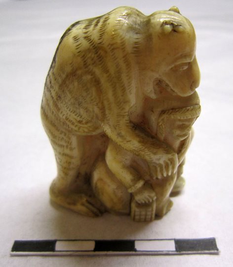 The original museum register entry for this carved figural object reads – “Carving, in sea horse tooth, representing a Greenlander attacked by a bear. Height 2in. Presented with No. 2530".