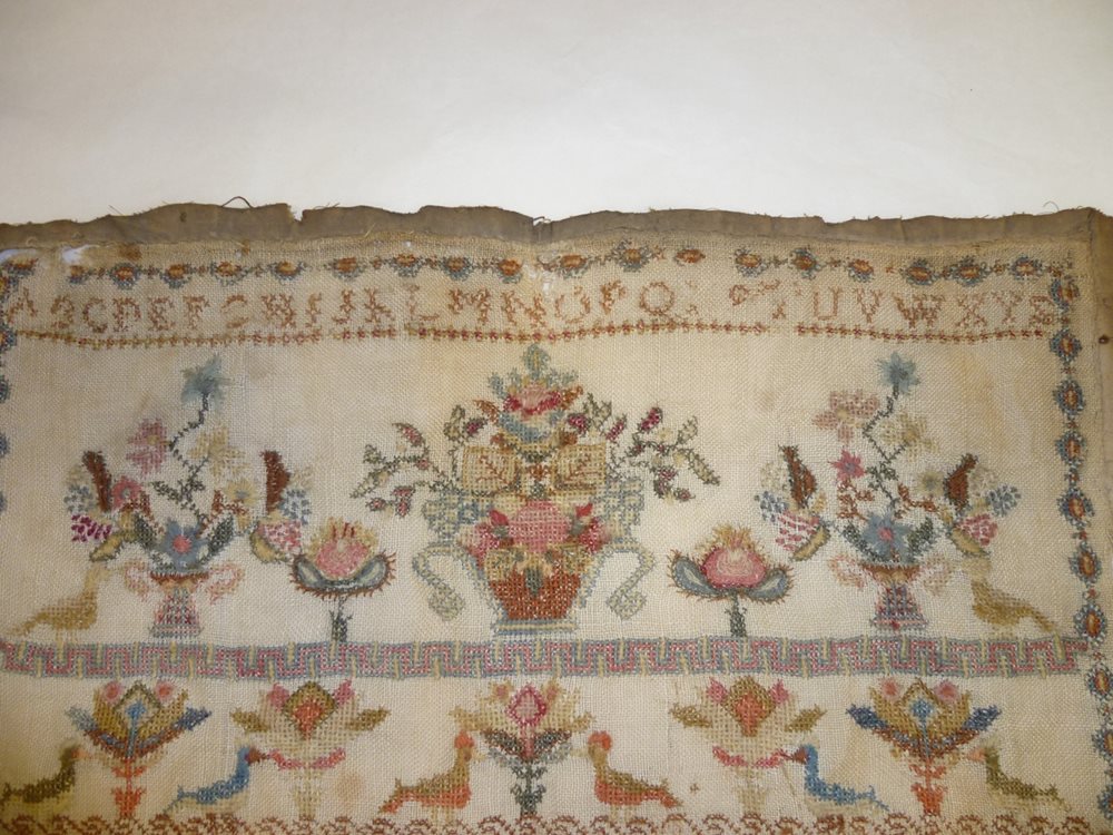 The sampler is embroidered primarily with a combination of letters, flowers and bird motifs. Along the top the alphabet is stitched in capital lettering and below this are three floral displays in vases reaching a height of 10 cm. Along the bottom are smaller floral displays interspersed with bird motifs in different colours.