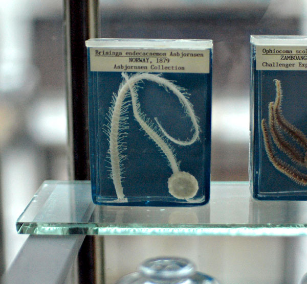The scientific name of this specimen tells us two interesting things about the species it belongs to. Firstly, it was Asbjørnsen himself that first discovered and named this species of starfish, hence his name appearing after the full scientific name: Brisinga endecacnemos Asbjørnsen, 1856.