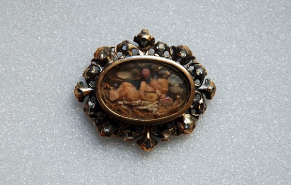 The second, R2882, is a gilt silver oval pendant with a decorative openwork frame into which sixteen diamante studs have been set. The centrepiece is a diorama featuring a wax figure of a recumbent baby surrounded by foliage, reminiscent of the infant Jesus in his manger.