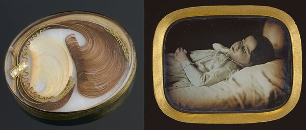 From the Georgian era (1714- 1830) onward, we see the popularisation of the ‘memento mori’, which both commemorated the life of a deceased loved one and reminded the owner that this too would be their inevitable fate. Locks of hair and depictions of skeletons were common, but it was not unusual to find the use of other body parts, such as teeth, or the somewhat macabre posthumous portraits of those who had passed.