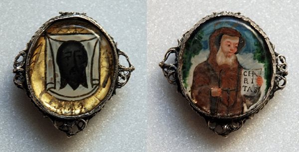 The first, R2881, is a silver oval case with delicate filigree bosses, one on the bottom and one on each side. The top is damaged but, judging by the remaining fragments, did not have an equivalent boss and may have instead had a loop for suspension. The silver frame encases two miniatures which were probably painted directly onto the bevelled glass inlays. One side features a depiction of the face of Christ on a white cloth, possibly an interpretation of the Turin Shroud. The opposing side most likely depicts St Francis of Assisi in monastic habit.