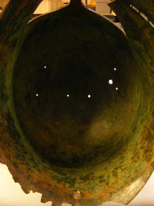 There are man-made holes at the top of the helmet which may have been developed in order to attach a crest of horse hair, which could be affixed front to back, on two separate stilts or traversed across the top. Also present is a larger puncture which may have been caused by a blow from a spear or javelin.