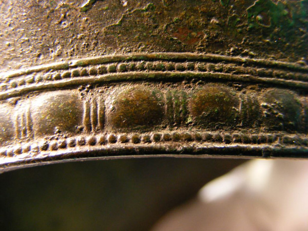 Many examples of Corinthian helmets are decorated and this particular helmet has an elaborate beaded design running around the edge. Helmets of this type were expensive to construct and, for many Greek hoplites, the level and detail of decoration reflected their social standing.
