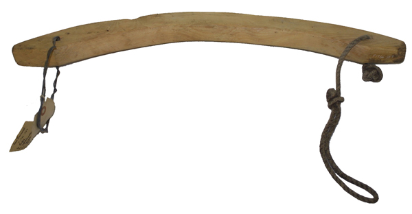 This cow trammel consists of a curved piece of wood 67cm long and rectangular in section 5.5cm wide by 3.5cm thick. The piece tapers for the last 5.5cm to a width of 2.0cm at both ends. The corners of the board are rounded. 7cm from each end, holes have been bored through. Through one of these a double piece of wire has been put to form a loop. Through the other hole a rope is placed and held in place by one end being knotted. The other end of the rope is tied into a slip knot.
