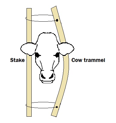 This type of cow trammel was once widely used in the Lisnaskea district of County Fermanagh for tying cows in byres. A wooden stake was set vertically in the floor of the byre. The wire string of the trammel was slipped over the stake. The cow’s neck went between the concave side of the trammel and the stake. The trammel was fastened in place by pulling the knot on the rope through the eye of the loop on the rope, the rope having been fixed around the stake.
