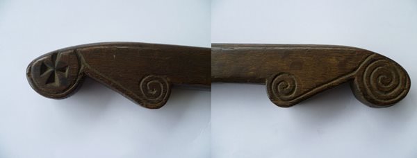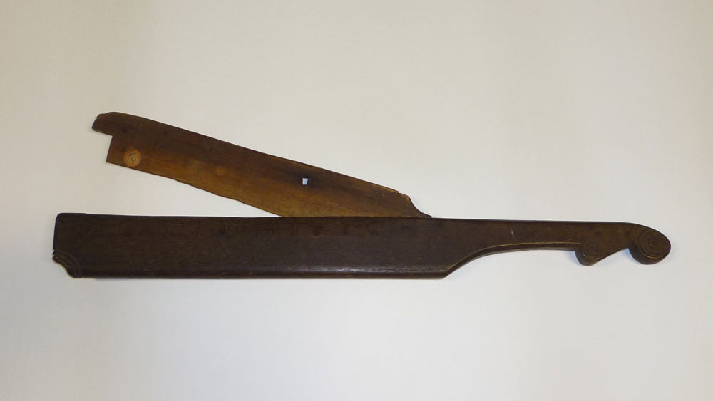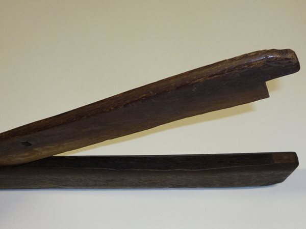 This wooden flax clove from Beara, County Cork consists of two sections. The larger of the two consists of a handle and a deeper part the upper edge of which has a deep rectangular groove. The second section is a chopper hinged at one end by a wooden peg and which works up and down in the groove. When both sections are closed, the flax clove measures 59.5cm long, 9cm high and 2.5cm wide. The handle bears two ornamental finishes at the end. Both sections are also decorated with parallel curved grooves which are described as being amateurish but confident.