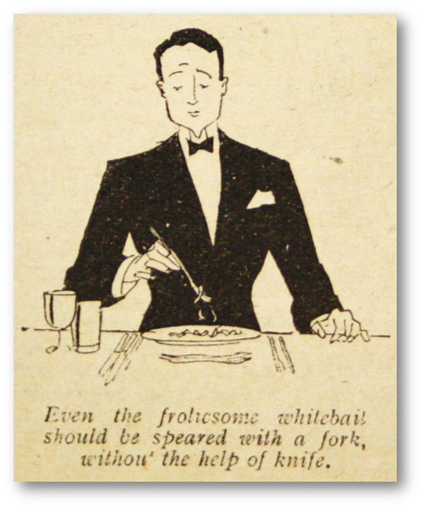 Advice on how to write complaints to a tradesman and how to give cocktail and sherry parties is dispensed with detail as are etiquette details for communicating with your doctor as “medical etiquette is rigidly strict and little known to the lay mind”. The chapter entitled “Things to Teach your Little Maid” is preceded by “The Technique of Table-Manners”. Here Lady Troubridge admits that while shell-fish are puzzling, luckily there are rules to govern how one approaches a shell-fish dish. Which utensil to use with various dishes is summed up thus, “the modern idea seems to be to dispense with a spoon whenever possible”.