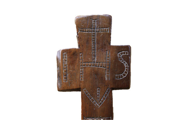 Penal crosses were made of a single piece of wood and of simple cruciform shape with short arms and a figure of Christ carved in high relief at the centre. They range in size from reasonably large (such as this example) to very small.