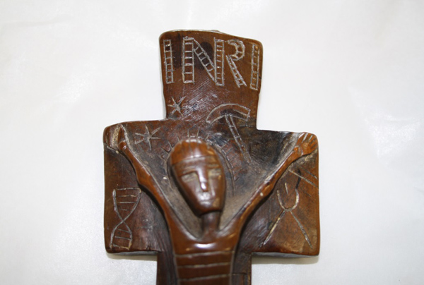 The cross is 28cm long and 6.5cm across the arms. The figure of Christ is in relief and from head to foot is 14cm long. Head is oval, crown of thorns shown by vertical lines, the arms are stretched upwards, the hands reaching to the upper corners of the cross arms. The torso is rectangular, ribs being indicated by 3 horizontal lines. Feet crossed and fastened together by a nail. Below the feet are the remains of an object which may have represented a skull. Across the top of the shaft is INRI in letters 1.5cm high and formed in ladder technique. The head is surrounded by a rayed nimbus and to the right above it are two stars and to the left a hammer. Below the feet are two lines in X formation, representing crossed bones. At the bottom of the shaft is a cock rising from a pot and a scourge with three lashes.