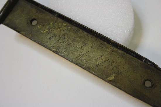 This small brass ‘shooter’ was used to lock the type on the press used to print the Proclamation of Independence. It is inscribed “C Brady”, one of the printers.