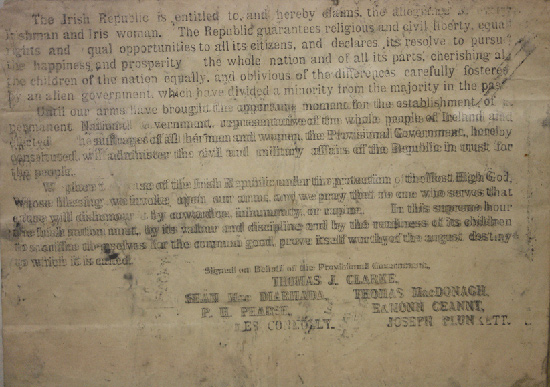 The ‘half proclamation’ was printed by British soldiers about April 29 - May 6, 1916, as they occupied the building after the surrender. They found the machine set up to print the bottom part of the Proclamation and printed a number of posters as souvenirs.