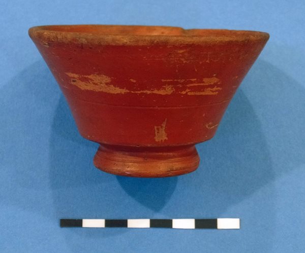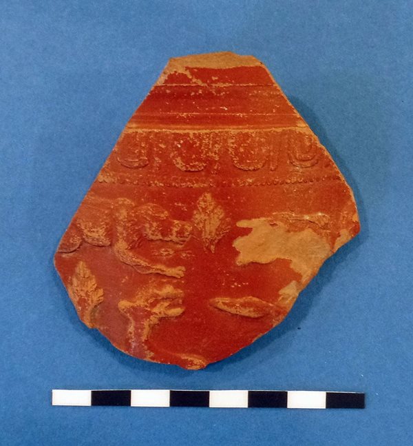Samian ware (Terra sigillata) is the name given to red-gloss pottery that was mass-produced from the first century BC to the third century AD. It was first produced in northern Italy but by midway through the first century AD it was nearly all being made in Gaul with some small scale production in Colchester in Roman Britain. Distinguished by its red colour, Samian ware is often elaborately decorated with typical classical scenes from mythology. Bowls, dishes, plates and small cups with decoration in relief were made by throwing the pot within a mould. Decoration could also be applied freehand and some potters signed their names onto the vessels. The shapes and sizes of Samian ware vessels were very standardised and similar in design to silver and glass tableware. Examples of Samian ware have been found as far afield as the eastern empire.