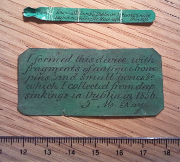 Ray labelled each item that he collected, detailing the find circumstances and giving the date of discovery. Many original labels remain adhering to the object surfaces, or tied securely to them, representing quite a unique and extensive collection of original 19th century antiquarian labels. The small squares of paper with their handwritten details are a very tangible connection to the man who stood beside the sewer trenches in mid-19th century Dublin recording details of antiquities he collected there.