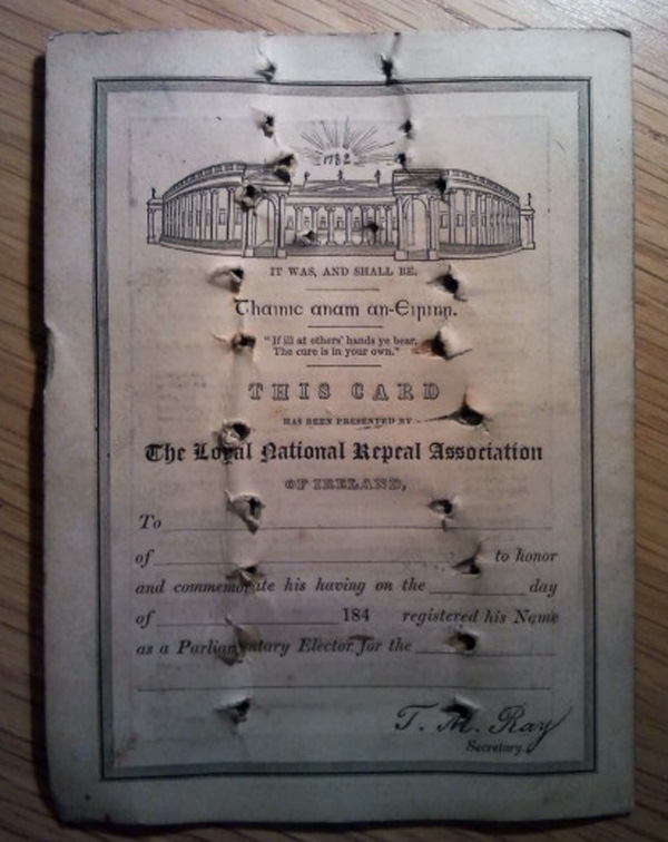 Figure 3: Loyal National Repeal Association membership card used as mount