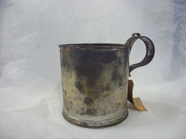 A large cylindrical tin mug, 16.6cm in height and 16.5cm in diameter. The base has been reinforced by a slightly flaring band with rolled over edges. The handle is made of a tin strip fixed to the vessel by four rivets. Soldered to the top of the handle is a small strip of tin forming a loop 1cm high and 1.5cm wide. The loop was designed to act as a thumb rest when holding the mug.