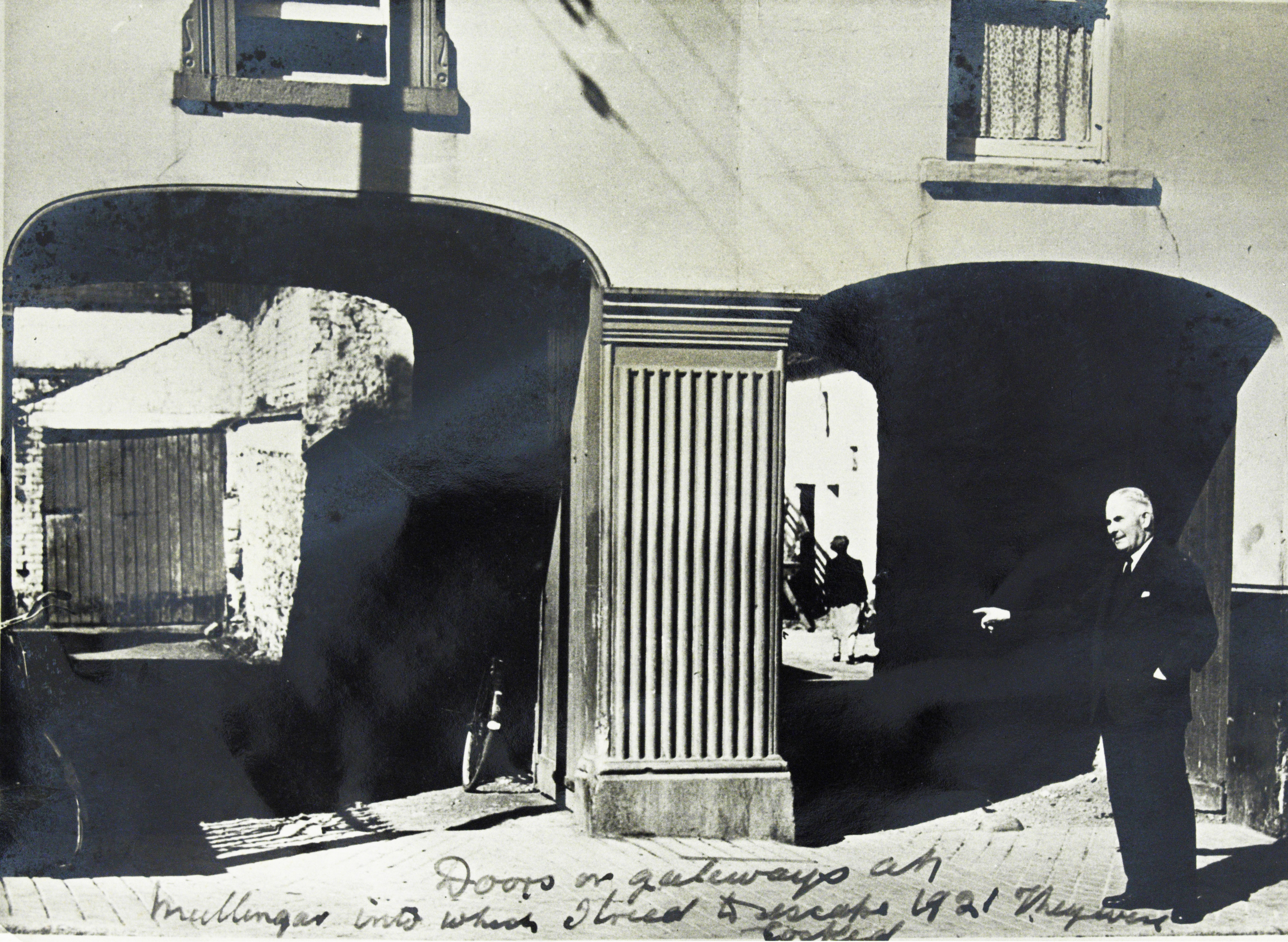General Seán Mac Eoin, leader of the North Longford Flying Column, and also known as the Blacksmith of Ballinalee, pointing out the place in Mullingar where he unsuccessfully tried to escape in 1921. Mac Eoin was sentenced to death, which was averted when Michael Collins insisted he be released as part of the Anglo-Irish Treaty negotiations.
