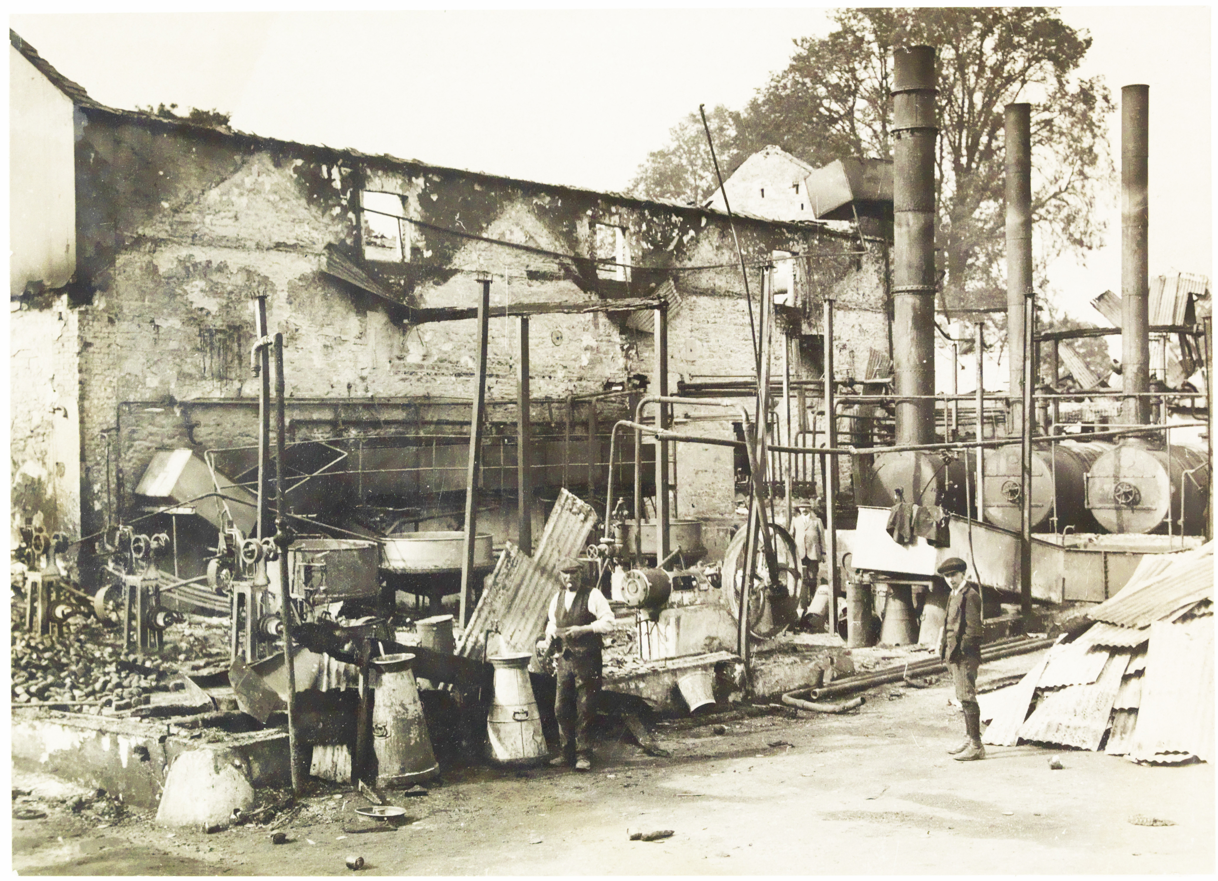The Sack of Balbriggan, 21 September 1920. The town was destroyed when a group of Black and Tans from Gormanstown Military Barracks carried out a reprisal burning for the IRA killing of two policemen. Shows theruins of a factory at Balbriggan. Destroying factories not only terrorised the population, but also crippled the local economy.