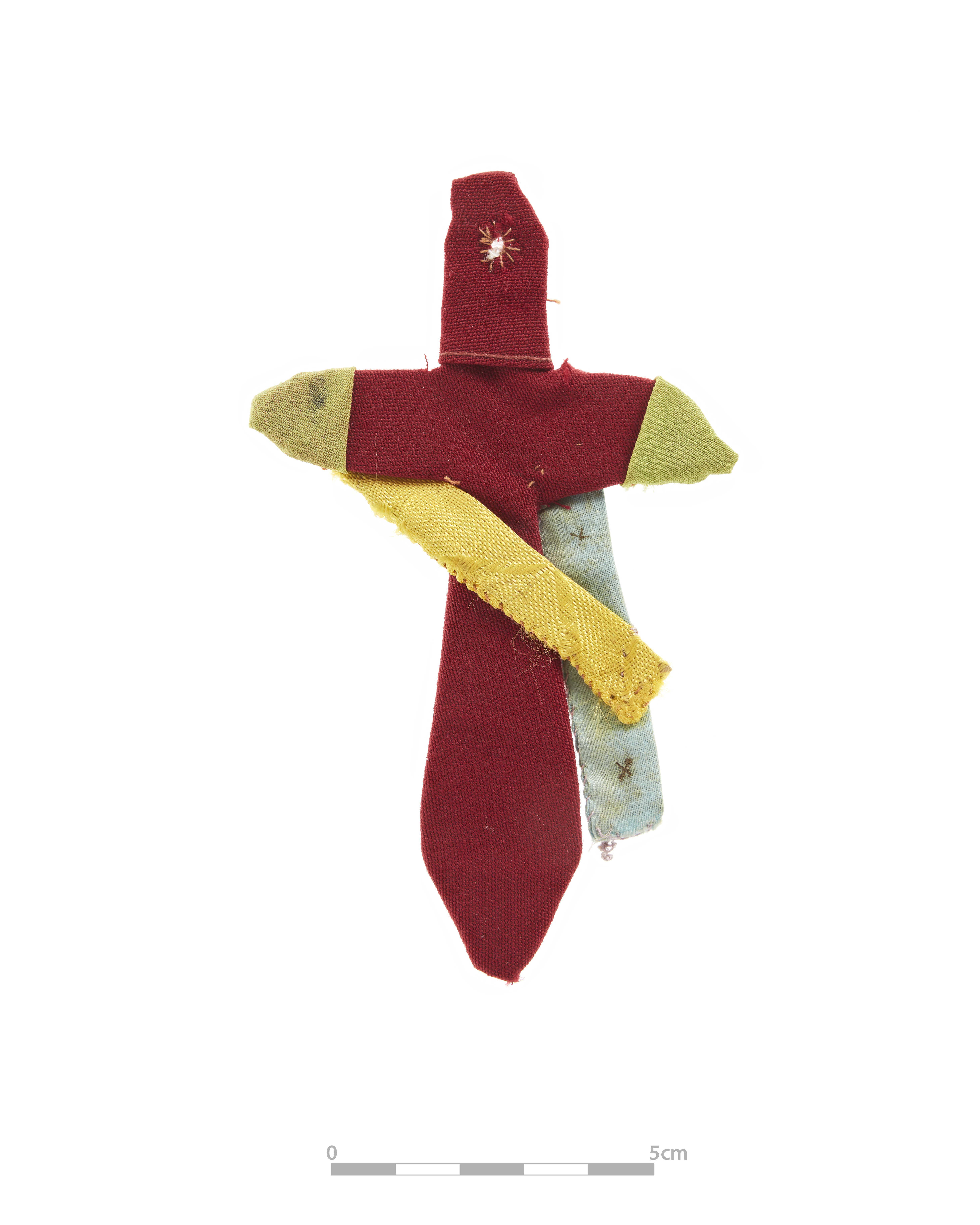 Donated by the Irish Folklore Commission (IFC). Presented by Pádraig Ó Fiannachta, National School Teacher, Kells, Co. Kerry. Made by Liam Siúbhlóid (William Walker), a pupil of Kells National School, under the instruction of his uncle, Liam Ó Miónséil (William Maunsel), age 80, both natives of Kells. Ó Fiannachta noted that “This type of cross was worn in the district in the old days. It was worn on the lapel of the coat. Originally, the green colour was obtained from the penny leaf, the red from human blood drawn from the finger, the blue from heather, and the yellow from onion skin.”