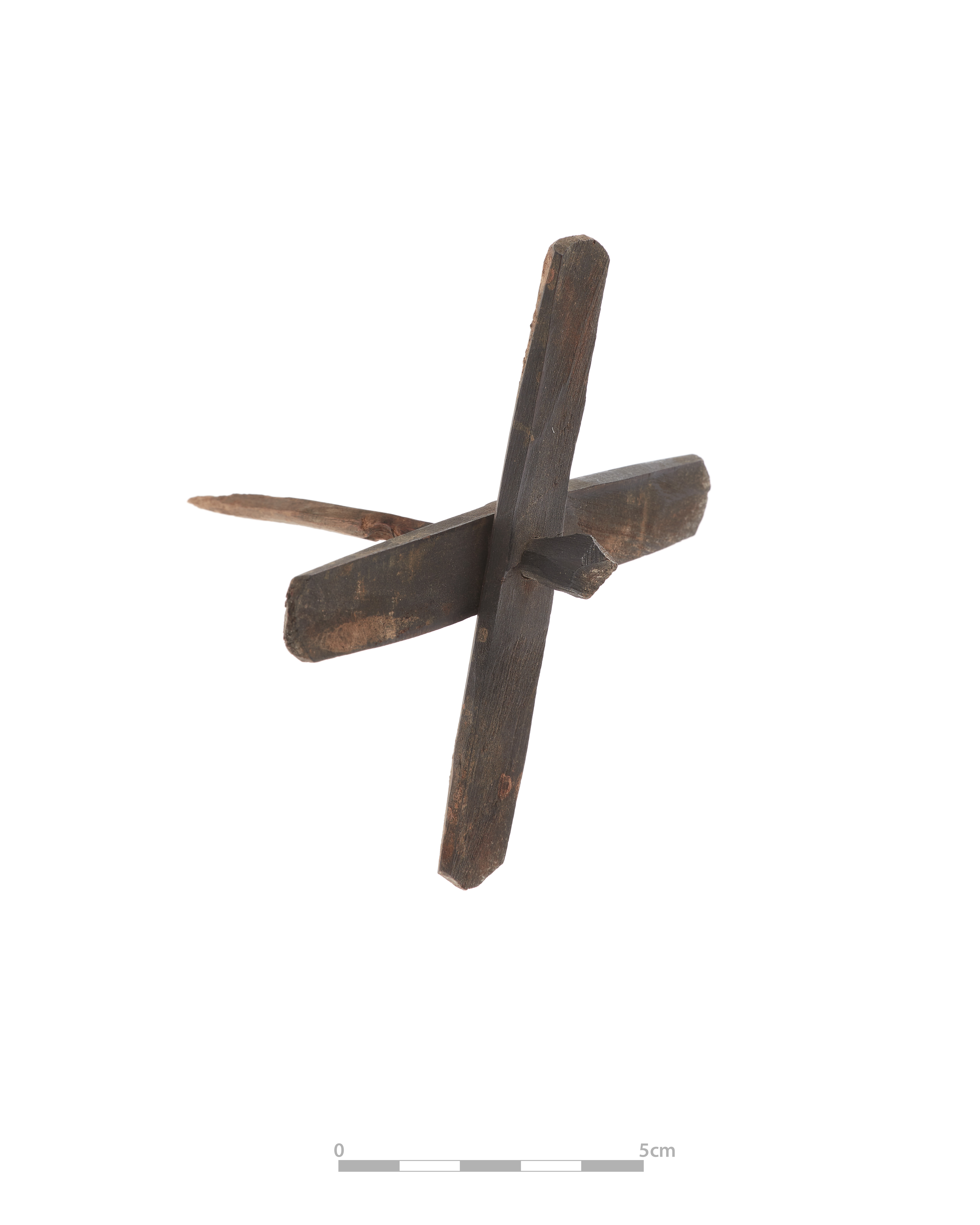 Donated by William Shields. He noted that while other patterned crosses in the Magheracranmoney area were made of rushes, in one house in the district these wooden crosses were pinned into the under thatch above the kitchen door.