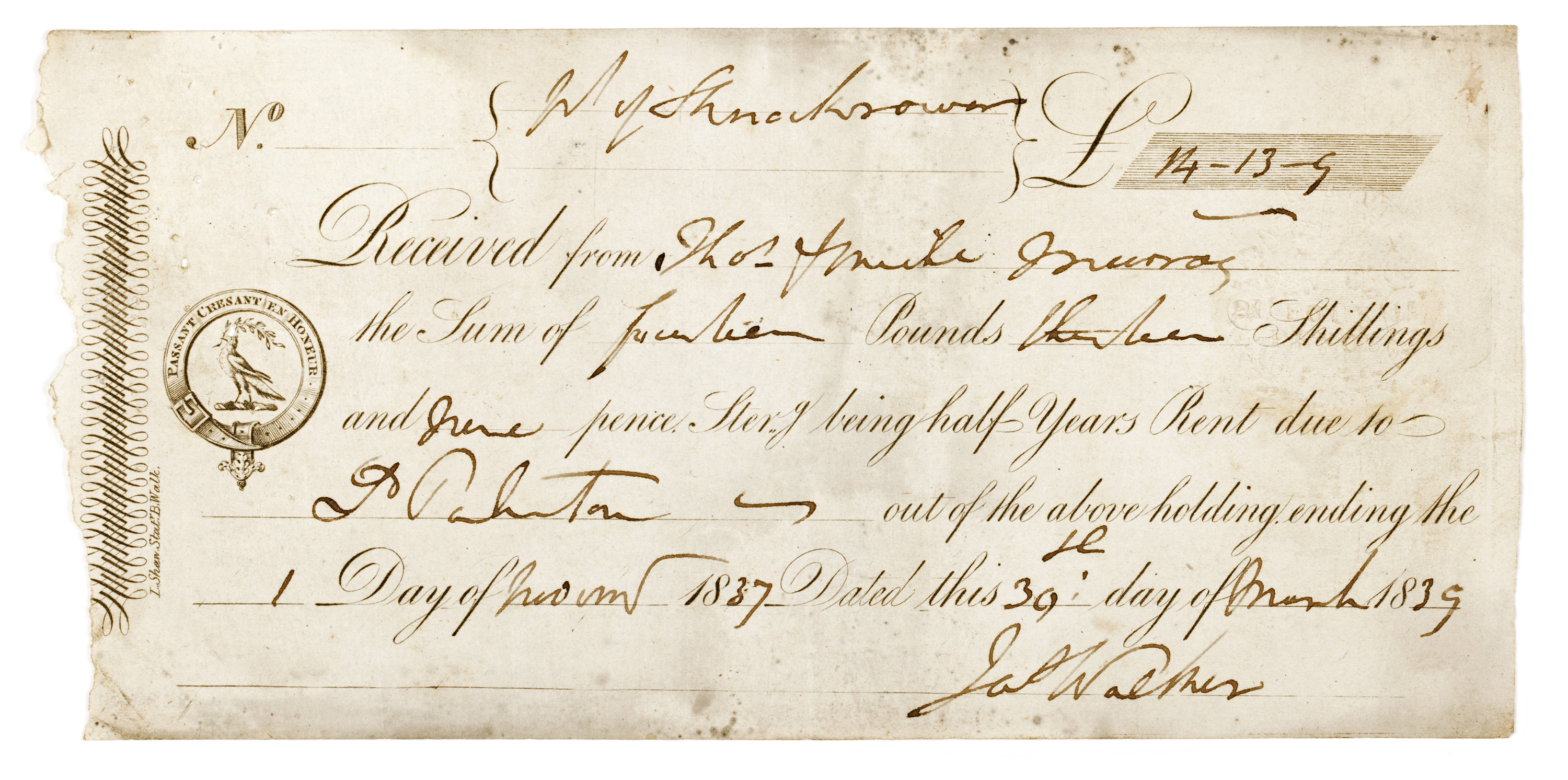The Murrays’ landlord at this time was Henry John Temple, 3rd Viscount Palmerston. This receipt, dated 30th March 1839, records Thomas and Michael Murray have paid Lord Palmerston 14 pounds, 13 shillings and 9 pence for a half years rent. 20 x 9.5cm