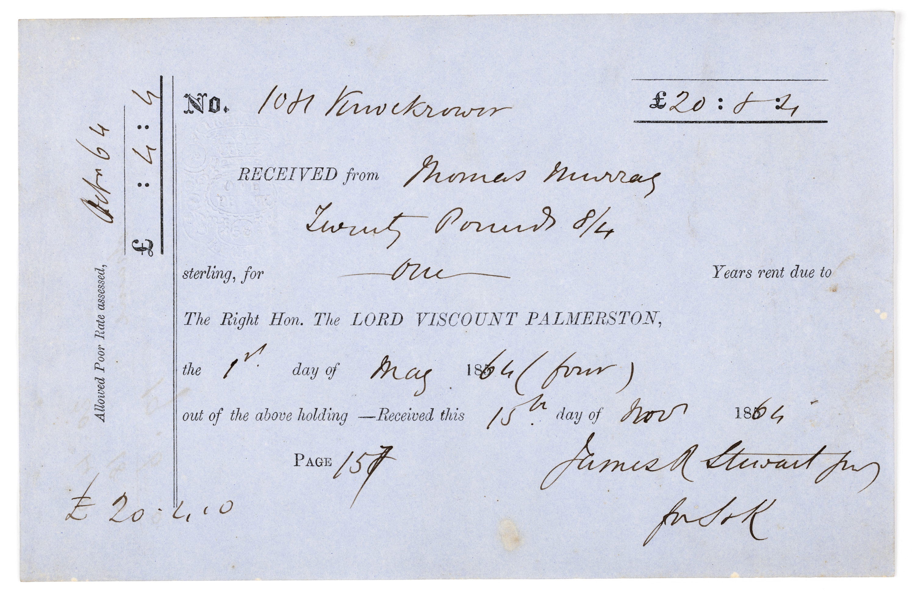 Received from Thomas Murray £20 8s 4d for one years rent due to The Right Hon. The Lord Viscount Palmerston. Dated 15th November 1864. 19.5 x 13cm