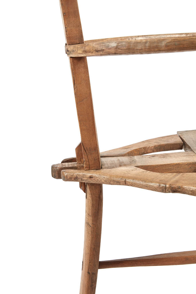 A distinguishing feature of this chair type is that single board that forms the back leg and extends to form the back rest. As you view this chair from the side, you can see the backrest rakes backwards, providing both comfort and stability. The chairmaker required a thick length of timber to achieve this effect.