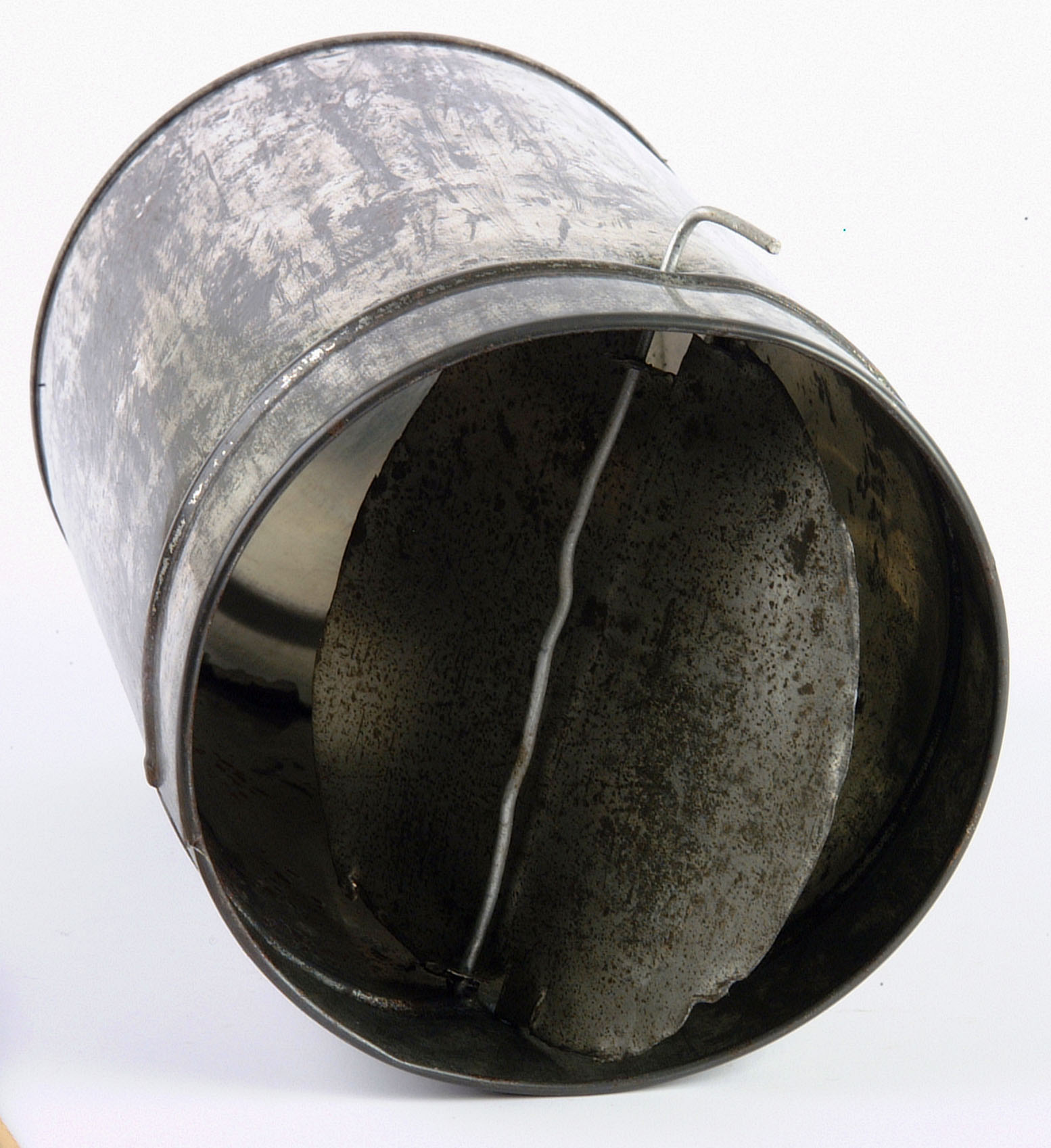 It consists of a tin canister 16.5 cm high and 11 cm in diameter. Below the rim, a wire axle has been inserted horizontally across the diameter of the canister through two holes in the sides, the ends of the wire being bent down to secure it in position.A circular trapdoor is fitted on the axle, secured by having a small lug cut out of opposite sides and bent upwards at right angles to the rest of the trapdoor. The axle passes through holes in the lugs. The trapdoor thus rests in a horizontal position across the mouth of the canister.