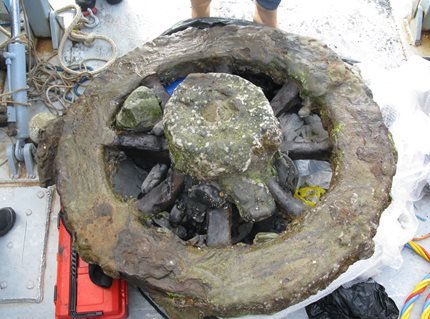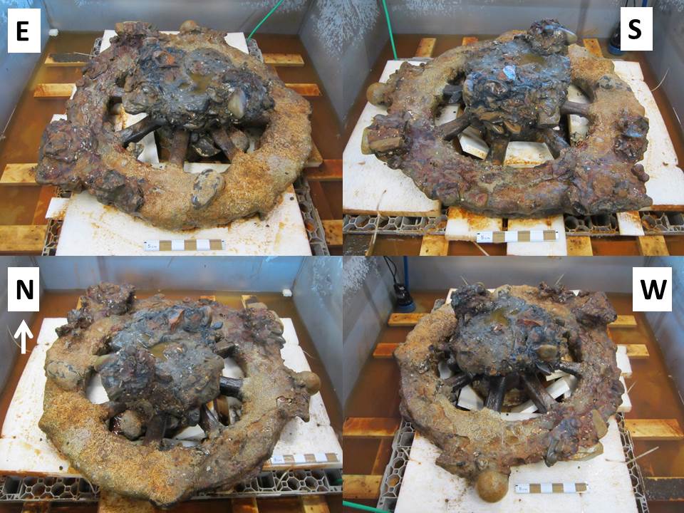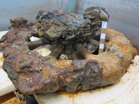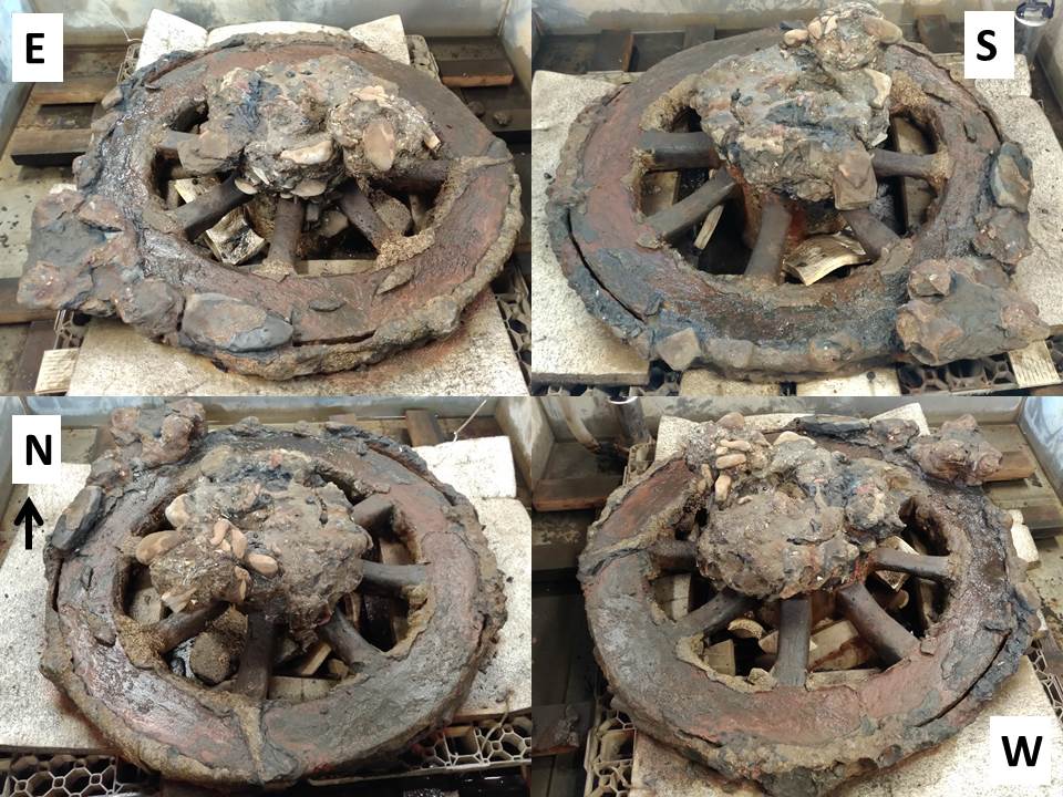 Marine archaeological objects are often hidden by thick unsightly concretions that obscure its true form and construction, and the carriage wheel is no exception. It is covered in a concretion which grew from iron on the wheel rim and wheel hub corroding and interacting with the surrounding environment to create a hard, compact mass of sediment, stones, corrosion product and marine organisms. To reveal the true nature and size of the wheel, the concretion has to be removed.