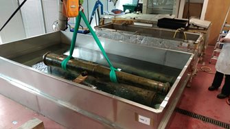 When the cannons were raised, they were completely impregnated with salt from the sea. Salt, when combined with oxygen and water in the air, causes rapid corrosion in metal, so the salt had to be removed before the cannon could be dried out. This was achieved by placing the cannons in tanks of fresh water, alternating between hot and cold to make the metal expand and contract to force the salt out. The last two washes were carried out with de-ionised water, to ensure that the salt content of the cannons was as low as possible.