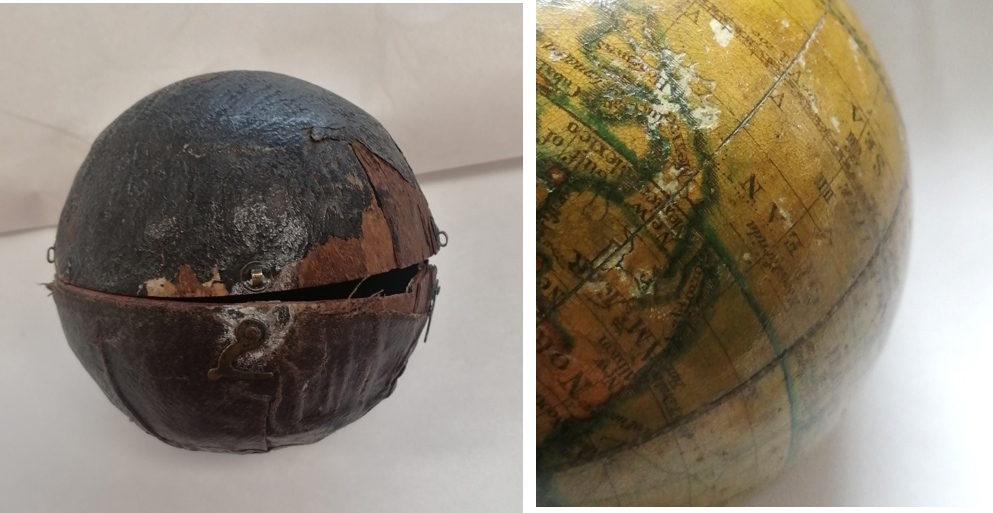 The manufacture of historic globes was well documented and both parts of this object follow a fairly standard method of production. Both are made up of layers of wood, millboard paper, plaster, printed and hand coloured paper ‘gores’ and varnish. The outer surface of the case is covered with a layer of treated leather. Both globe and case have small metal features. Historic globes suffer specific types of damage as a result of the materials that make them – each layer reacts to environmental change and aging differently resulting in the stronger materials, the wood and millboard,  pulling apart the weaker plaster and paper layers.