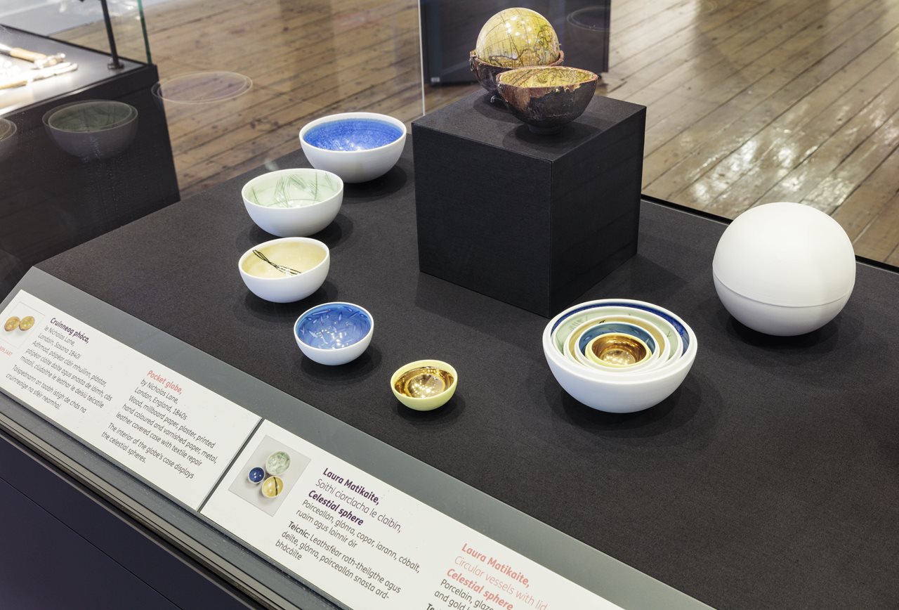 Last year a nineteenth century pocket globe and its associated container (DW:1909.1497) was delivered to my studio for treatment. This object had inspired Laura Maitkaite, a student of ceramics taking part in the NMI/ DCCI collaborative exhibition, InForm. The globe features a detailed map of the world as seen through the lens of a British Victorian worldview. The container, as well as providing safe storage for the globe, has two halves of a celestial map on its inner surfaces.