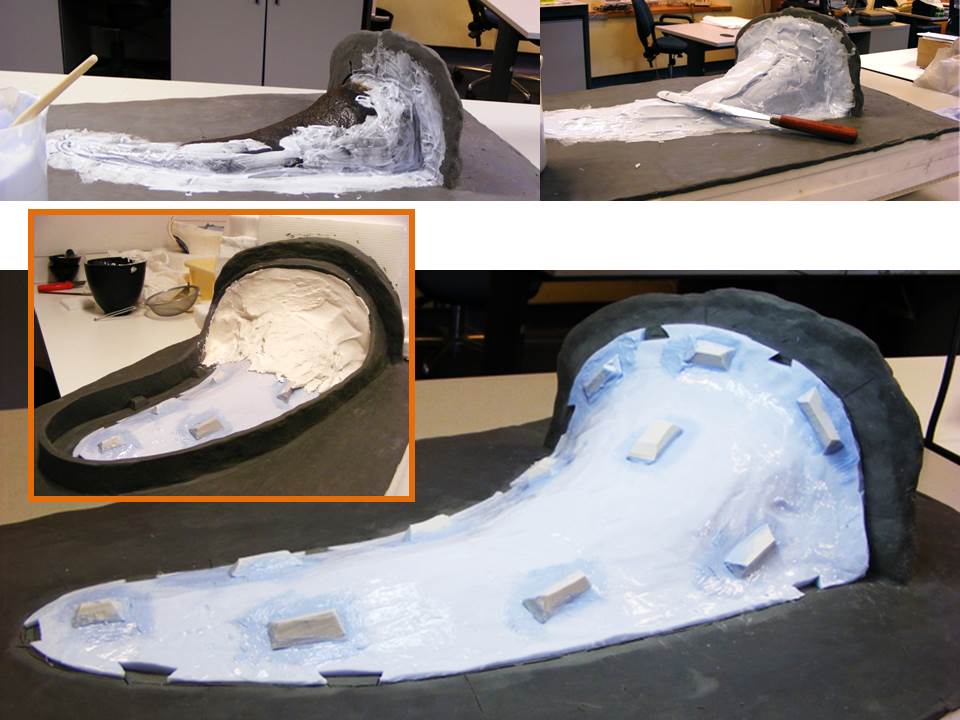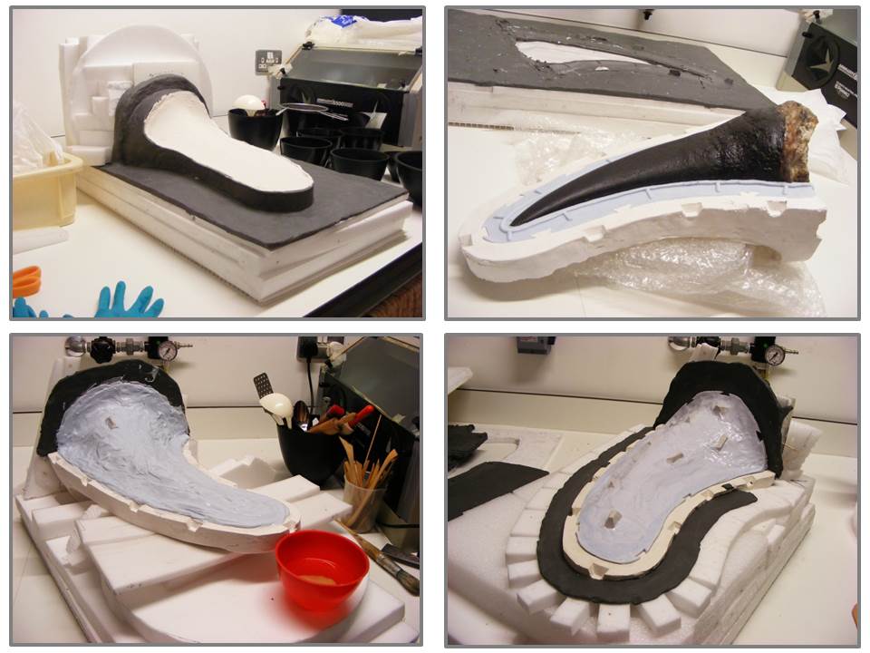Step 5: A three piece mould is created with two detachable sides and a top piece moulding the base of the horn. The silicone rubber is held rigid with a mother mould of reinforced plaster.
