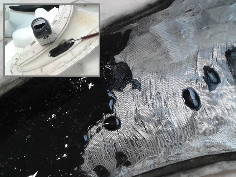 Step 6: The horn is removed from the mould. The silicone rubber interior is painted with dry powder pigment and tinted epoxy resin. Fibreglass fabric is laid into the epoxy resin to strengthen the sides of the replica horn.