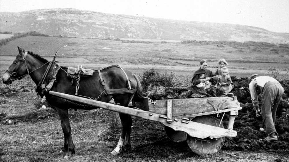 Transporting turf away from the soft terrain of the bog meant that certain old types of transport survived relatively late in parts of Ireland. The donkey with side panniers (baskets) was favoured along the western seaboard. The wheel-less slide car and the block-wheel cart survived into the mid-twentieth century in certain hilly parts of the eastern half of the country.