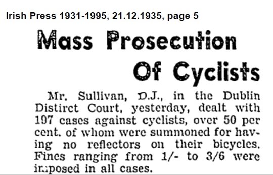 For the safety of road users, laws were introduced that prosecuted those cycling on footpaths or travelling in the dark without a light. Often on bicycles, the Royal Irish Constabulary and after 1922, the Garda Síochána, enforced this law throughout Ireland.