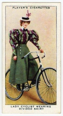 The bicycle gave women greater mobility and led to a dramatic change in ladies fashion. The first female cyclists rode tricycles, as ‘velocipedes’ and ‘penny-farthings’ could not be ridden while wearing the long and cumbersome dresses of the period. Victorian dress reform encouraged women to wear suitable attire for activities such as cycling. New designs of practical clothing, such as ‘bloomers’ and divided skirts, allowed greater freedom of movement.