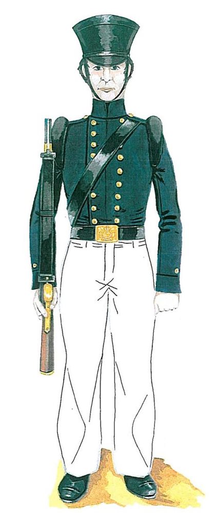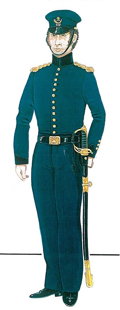 The uniforms of the Revenue Police were not unlike those of the County Constabulary and the later Irish Constabulary of the time. Early full dress included a plain shako as head gear and during the summer months white trousers replaced the blue (see image below). Shoulder scales were worn to display rank and for protection. The undress shell-jacket was also popular (see image below). Weapons carried by the Revenue Police included sword and carbine.