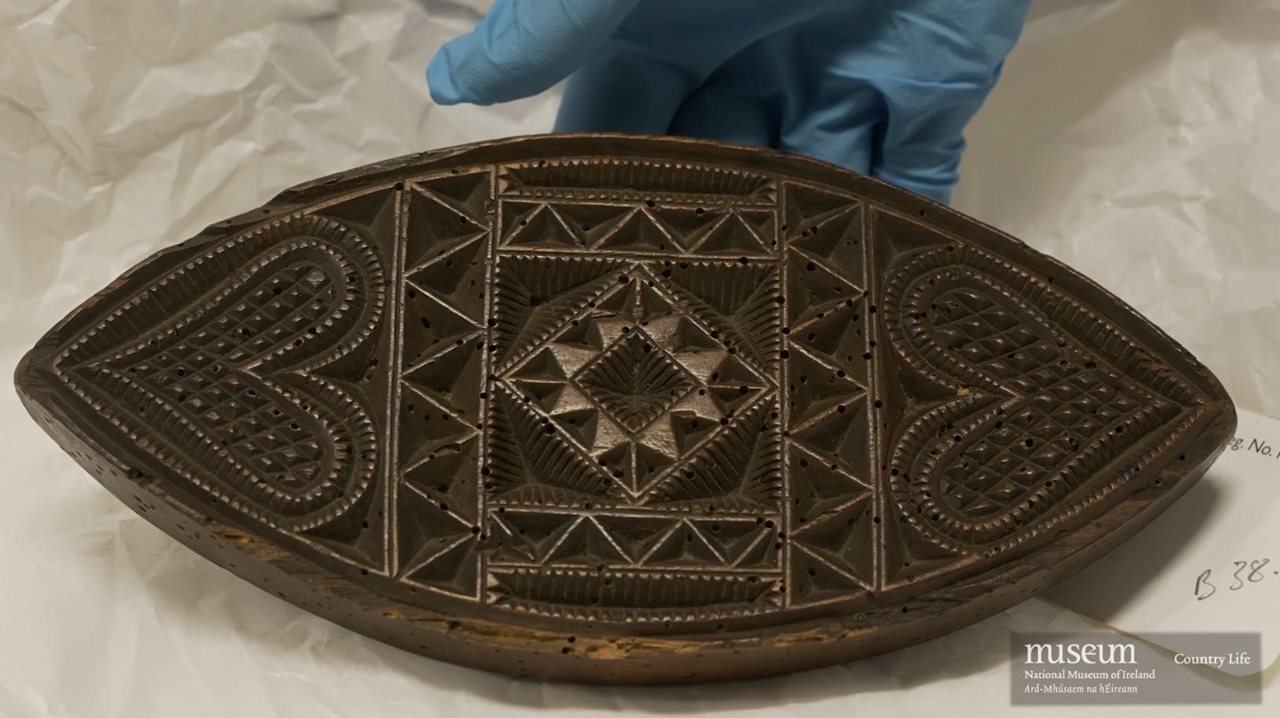 All those who visited the house at this time were encouraged to take a dash of the churn. They usually accompanied this with a prayer such as ‘God Bless the Work’. Holy water was often sprinkled on the animals, the churn and all objects associated with dairying. Some of the early butter-prints in the National Museum of Ireland’s Collection reflect this belief and are shaped like an eye. May butter was often kept and used in small quantities to add to the churn and dairy items for good luck and protection.
