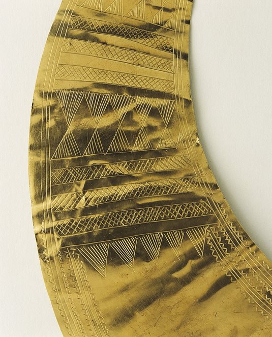 However the use of gold bars, either plain or with hammed flanges was an important development. An array of multifaceted neck ornaments, earrings and bracelets were made by twisting thin strips of gold sheet and gold bars.