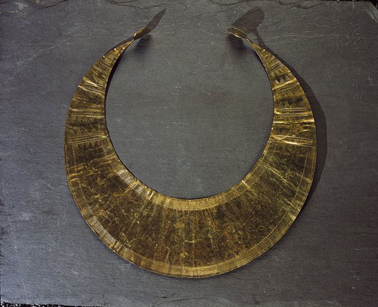 The crescent-shaped lunula, with expanded horn terminals set at right angles to the plane of the crescent, is the most characteristic gold object of the Irish Early Bronze Age.