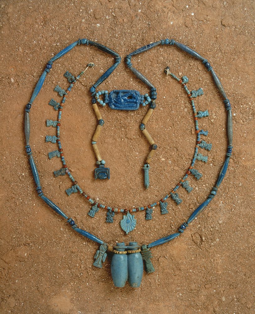 The eastern deserts supplied gold and a colourful range of semi-precious stones. Silver, imported from the area of modern Greece and Turkey and lapis lazuli from central Asia, were used to produce jewellery which was worn by both men and women. The materials used and the styles changed over time with major innovations occuring in the New Kingdom, c.1550-1069 BC. Semi-precious stones were imitated in coloured faience and glass paste. Egyptian faience is an artificial composition of quartz sand, copper or bronze filings and an alkali.