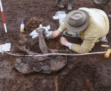 It appears that the body had been placed on the bog surface, possibly in a pool, and two hazel rods marked the place of deposition. The remains are those of a young adult male and wounds noted on the body suggest that one is dealing with a victim of human sacrifice. Injuries noted include a long cut on the lower back and a broken arm. The areas of the body that would have been targeted to inflict fatal injuries such as the head, neck and chest were too damaged by the milling machine for a determination of the cause of death to have been made. Earlier reports based on the initial pathologist’s examination, which suggested the presence of axe wounds on the back and a broken spine have now been revised. It is now thought that these represent damage caused by the milling machine and by natural compression in the bog.
