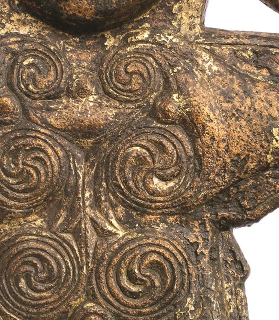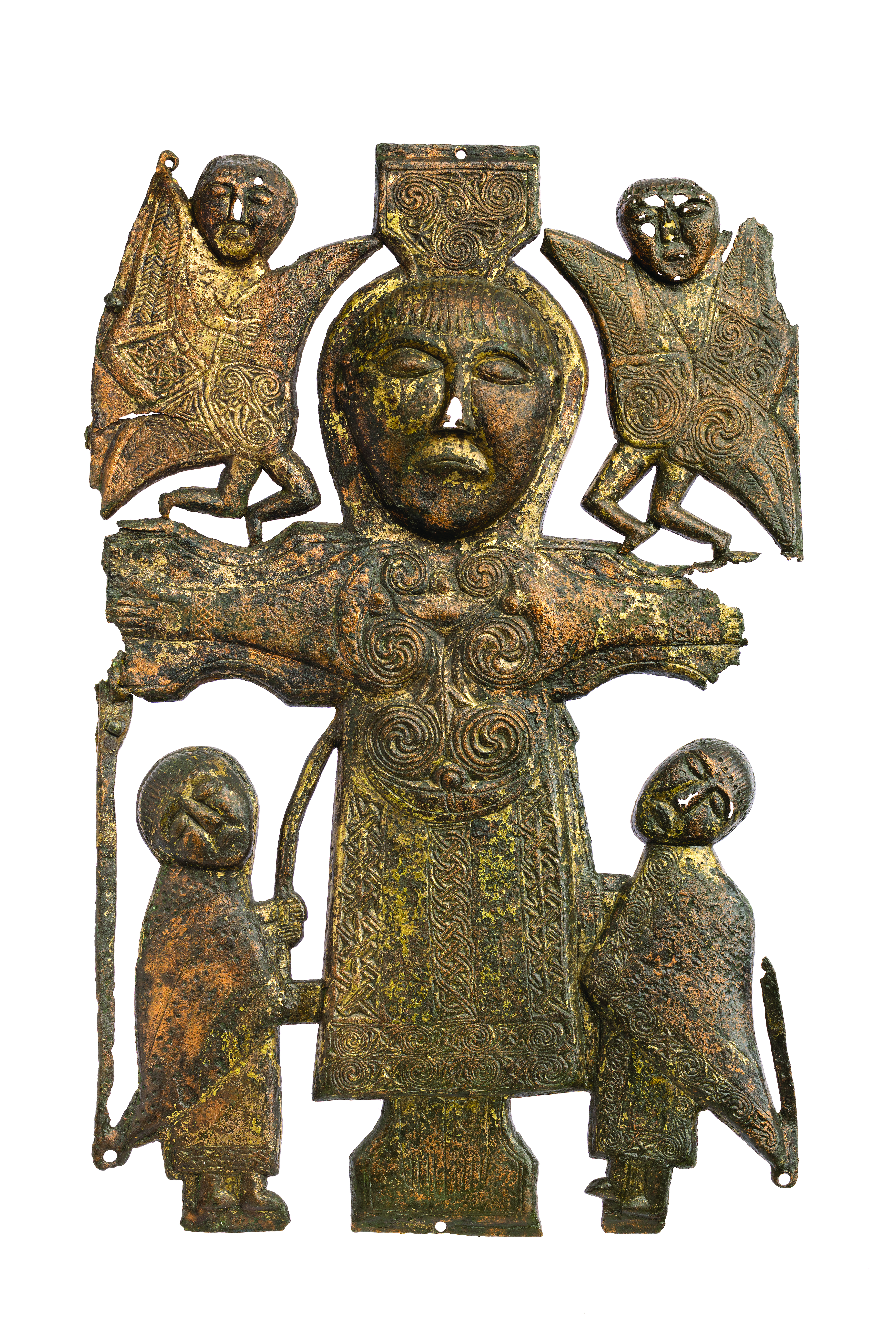 The depiction finds a close parallel in another object on display in the Words on the Wave exhibition. A Crucifixion plaque found at Rinnagan, Co. Roscommon, which lies on the River Shannon north of Athlone, also features a beardless Christ flanked by two angels above and Longinus and Stephaton, with heads tilted backwards, below. Christ’s garment is in this case decorated with Ultimate La Tène, interlace and fret patterns. This plaque has been dated to the 8th or, more likely, 9th century. The same arrangement of Christ, the two angels, and Longinus and Stephaton can be seen on several Irish high crosses of 9th- and 10th-century date. Generally, the Crucifixion scene appears at the crossing on the head of the high crosses, but in the case of the South Cross at Clonmacnoise it is carved in a panel on the west face of the shaft, though it is now badly weathered. This rectangular setting, the probable mid-9th-century date of the high cross and the proximity of Clonmacnoise to Rinnagan makes the South Cross perhaps the best comparison in stone for the arrangement found in Cod. Sang. 51 and on the Rinnagan Plaque. Indeed, Harbison has speculated that the Rinnagan Plaque may have been produced at Clonmacnoise, and there is a very similar Crucifixion plaque of somewhat later date surviving from the monastic site. It is quite likely that the craftspeople behind the manuscript, metalwork and stone representations were sometimes copying models drawn from a different medium.
